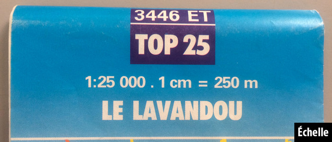Toute carte a une échelle (exemple 1:25 000e, l'échelle des fameuses cartes de randonnée Top 25 éditées par l'IGN) indiquée sur sa couverture et dans sa légende. Le premier chiffre représente la distance sur la carte, le second sa correspondance sur le terrain. Sur une carte au 1:25 000e, 1 cm sur la carte correspond donc à 25 000 cm dans la réalité, soit 250 m. Les cartes à l'échelle 1:25000e sont à privilégier pour effectuer une randonnée.