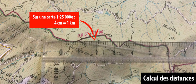 L'échelle qui est indiquée sur la carte vous aidera à calculer des distances. En effet, si vous possédez une carte au 1:25 000e, sachant que 1 cm sur la carte correspond à 250 m dans la réalité, on pourra rapidement calculer que 4 cm sur la carte représenteront pour vous une distance de 1 km. Sur les cartes au 1:100 000e et plus, un kilométrage est également indiqué le long des routes.
