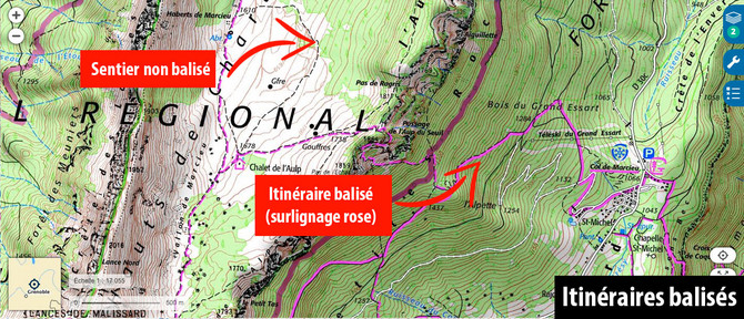 Les itinéraires balisés sont surlignés d'un trait rose foncé. On distinguera les itinéraires importantes (type GR ou GRP), au trait plus épais, des autres sentiers (sentiers locaux, PR...) pour lesquels le trait est plus fin. Dans le cas d'itinéraires hors sentiers, la ligne rose sera représentée en pointillés qui, de la même manière, sera plus épaisse pour les GR que pour les autres types de sentiers. Enfin, le nom des principaux sentiers balisés est annoté le long de leur cheminement. À noter que les itinéraires en bleu foncé sont les itinéraires à ski de randonnée.