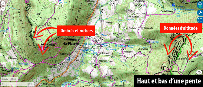 Plusieurs indicateurs vont vous permettre de distinguer le haut du bas d'un relief. Tout d'abord, les altitudes mentionnées sur les points de la carte mais aussi sur certaines courbes de niveau vous permettront de "voir" le sens de la pente. Avec un peu de pratique, l'éclairage, les ombrés, les zones rocheuses ou les rivières vous permettront de visualiser le terrain en 3D à la simple lecture d'une carte.