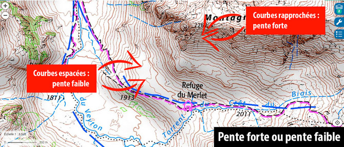 C'est l'espacement des courbes de niveau qui vous donnera l'indication de la pente. Plus celles-ci sont rapprochées, plus la pente est forte. Il arrive même que la pente soit tellement raide qu'on parvienne à peine à distinguer les courbes de niveau : la carte représente alors des zones de rochers. A contrario, des courbes de niveau très espacées indiqueront un relief de pente faible ou quasi-plat.