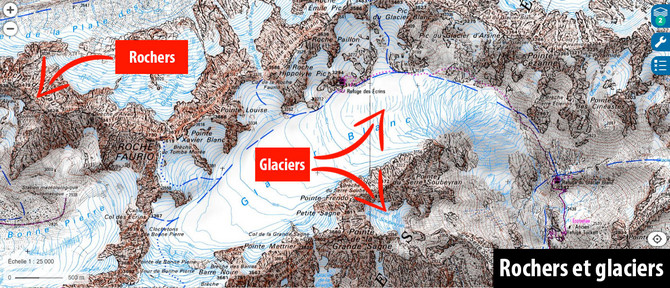 La couleur bleue est utilisée pour l'eau : rivières, lacs, etc... Sur les hauts reliefs, lorsque les courbes de niveau sont tellement serrées qu'elles en deviennent illisibles, la carte comporte un dessin spécifique pour représenter les secteurs rocheux et les falaises. Les zones de pierriers ou d'éboulis sont représentées par de simples petits points noirs . Si les courbes de niveau deviennent bleues, il s'agit d'un névé permanent ou d'un glacier.