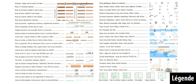En cas de doute, n'hésitez pas à vous référer à la légende qui figure sur le rabat interne de votre carte. Certains symboles sont utilisés pour représenter des ouvrages spécifiques (entrée de mine, phare, éolienne, croix...) ou préciser un type de végétation (vigne, verger...).