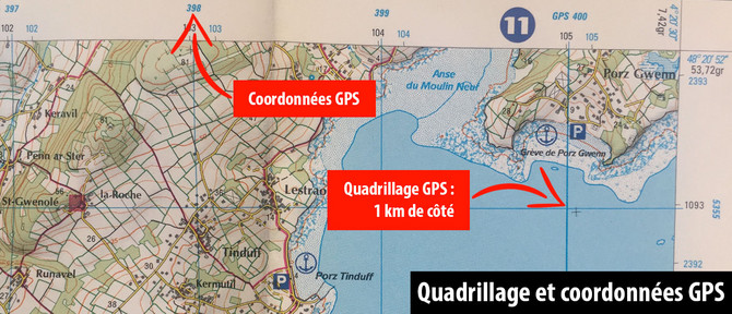 Votre carte comporte différents quadrillages de couleur noire ou bleue et des repères dans la marge associés à des coordonnées. Sur les cartes récentes, portant la mention "compatible GPS" sur la couverture, le quadrillage bleu correspond à des carrés de 1 km de côté. Il est associé à des chiffres de coordonnées au format UTM-WGS84, utilisé par les récepteurs GPS. D'autres repères et coordonnées sont présents dans la marge (en bleu ou noir) et sur la carte (croix noires fines). Ils permettent de calculer, à l'aide d'une équerre graduée, les coordonnées de n'importe quel point de la carte exprimées en degrés ou en grades.