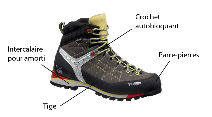 Les semelles de propreté absorbent et évacuent la sueur. Elles sont d'ordinaire amovibles et facilement remplaçables si leurs performances déçoivent. En général, celles fournies par défaut sont souples et ne maintiennent que très légèrement la voûte plantaire. Les semelles rigides assurent un vrai maintien et celles sur mesure sont conseillées aux personnes ayant des pieds creux ou plats. La prise d'empreinte se fait en quelques minutes. Le côté imperméable de la chaussure peut être intéressant pour les randonnées longues ou dans les zones où la météo est variable. Attention, les membranes de type Gore-Tex n'empêchent pas d'avoir les pieds mouillés s'il y a trop d'humidité extérieure qui sature le tissu et empêche la sueur d'être évacuée. À noter que, parfois, la membrane ne couvre pas toute la chaussure. Les pare-pierres à la pointe de la chaussure sont indispensables pour la randonnée en montagne.